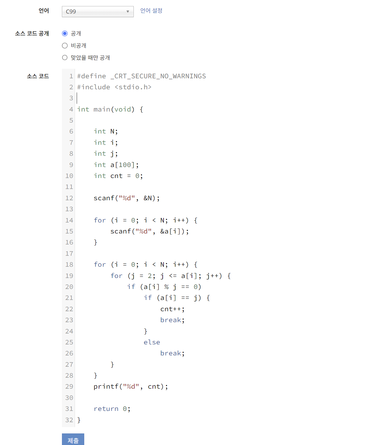 현재 코드는 모든 수에 대해 2부터 a[i]까지 나누어 보면서 나누어 떨어지는 경우 cnt를 증가시킨다.