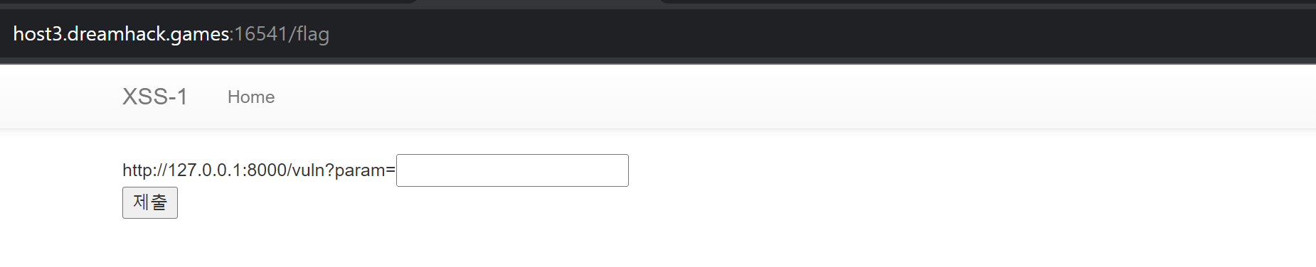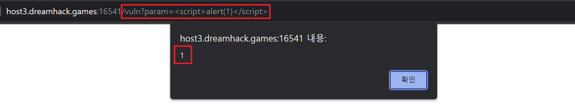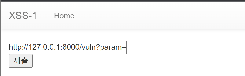 vuln 페이지에 param 값으로 <script>alert(1)</script>이 전달되어 "1"이라는 내용의 팝업창이 뜨는 것을 확인할 수 있다.