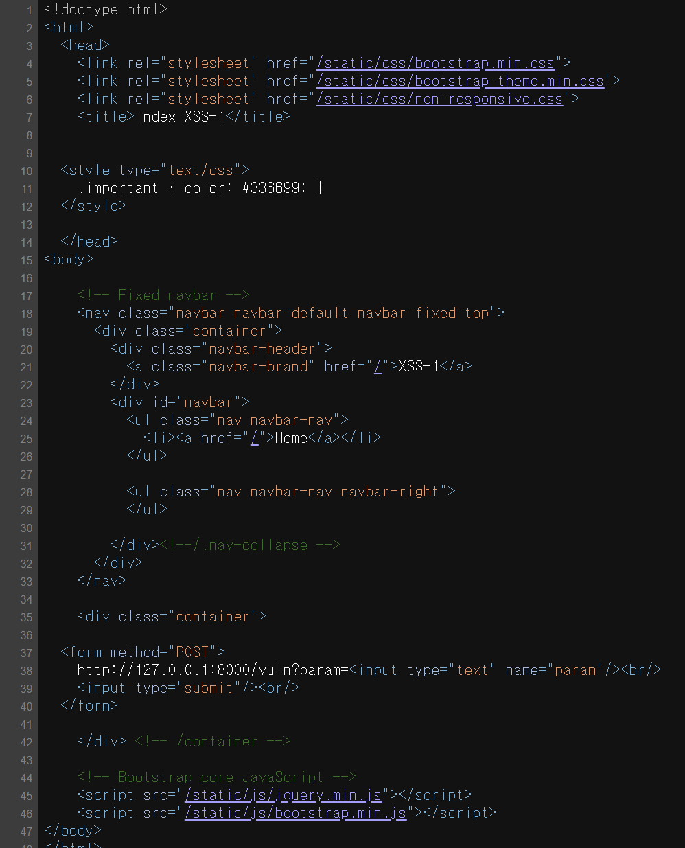 http://127.0.0.1:8000/vuln?param=<input type="text" name="param"/><br/>