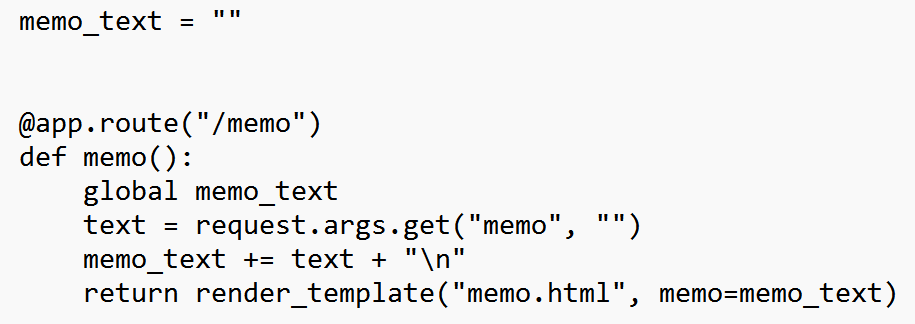 text = request.args.get("memo", ""): 사용자는 "/memo" 경로로 접속하여 URL에서 "memo"라는 인자를 받아온다.