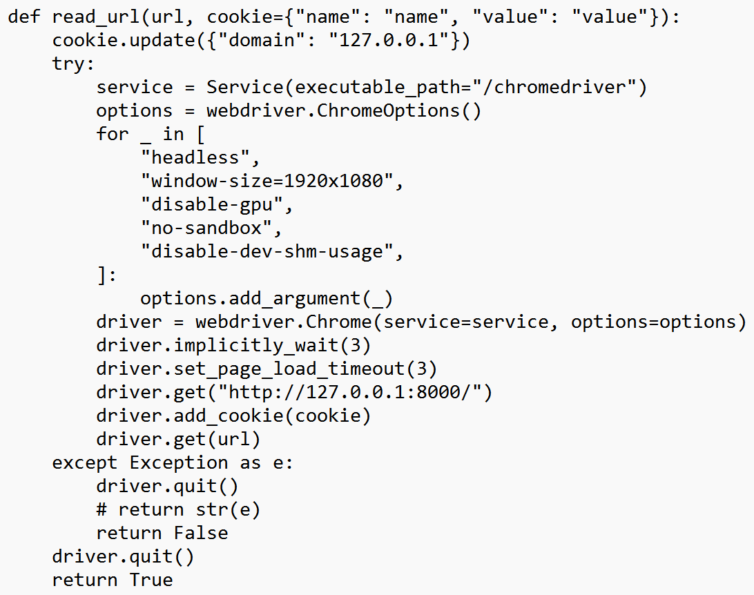 check_xss()를 보면 127.0.0.1:8000을 대상으로 flag가 포함된 쿠키를 read_url()의 인자로 실행한다.