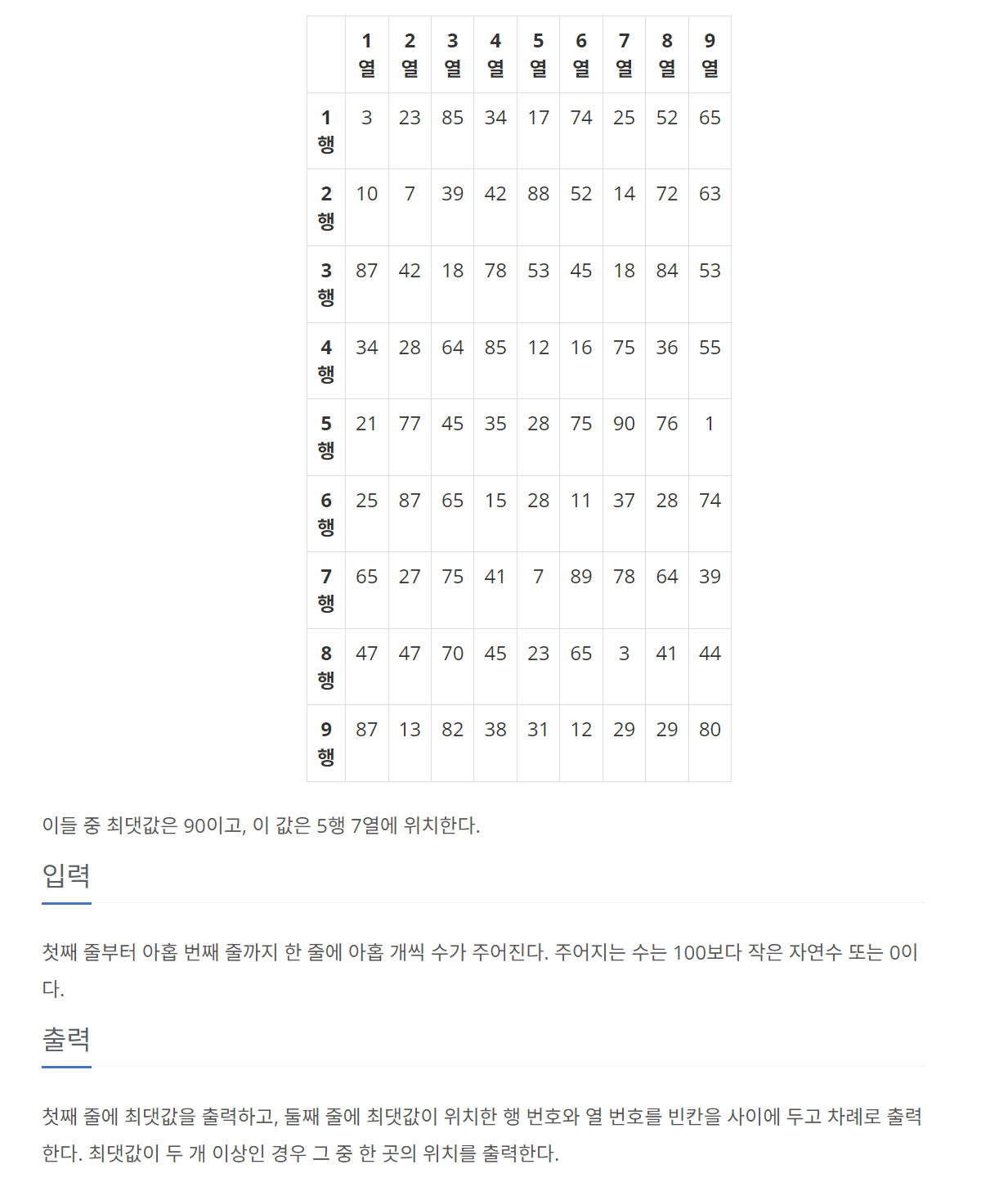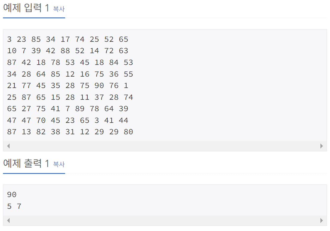 - 격자판을 입력하는 중에, 최댓값(maxVal)이 갱신될 때마다 최댓값을 저장하는 변수들(maxRow, maxCol)을 업데이트한다.