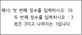 1 2 3 4 5 6 7 8 9 10 11 12 13 14 15 | #define _CRT_SECURE_NO_WARNINGS #include <stdio.h> int main(void) { int x, y; printf("첫 번째 정수를 입력하시오:"); scanf("%d", &x); printf("두 번째 정수를 입력하시오:"); scanf("%d", &y); int q = x / y; int w = x % y; printf("몫은 %d이고 나머지는 %d입니다.", q, w); } | cs |