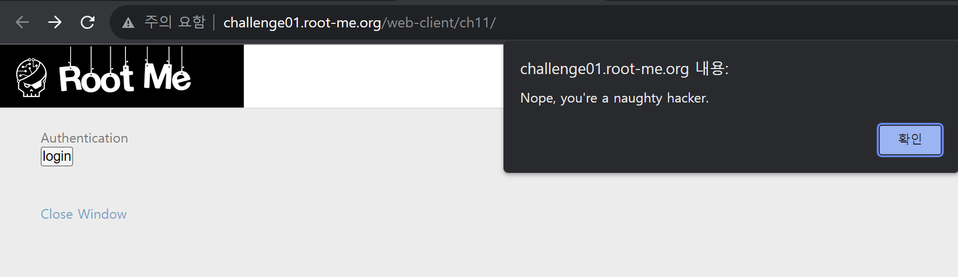 그런데 또 "Nope, you're a naughty hacker." 라고 써있는 팝업창이 떴다.