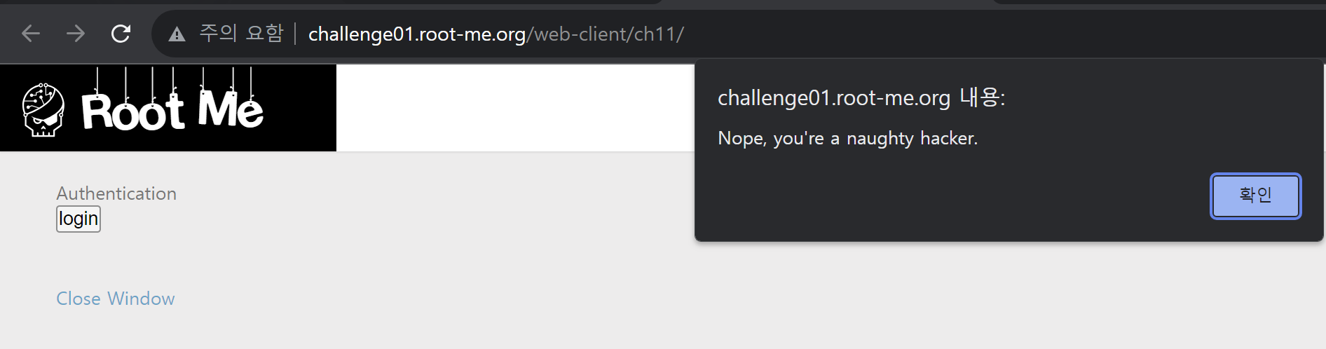 "Nope, you're a naughty hacker." 라고 써있는 팝업창이 뜬다.